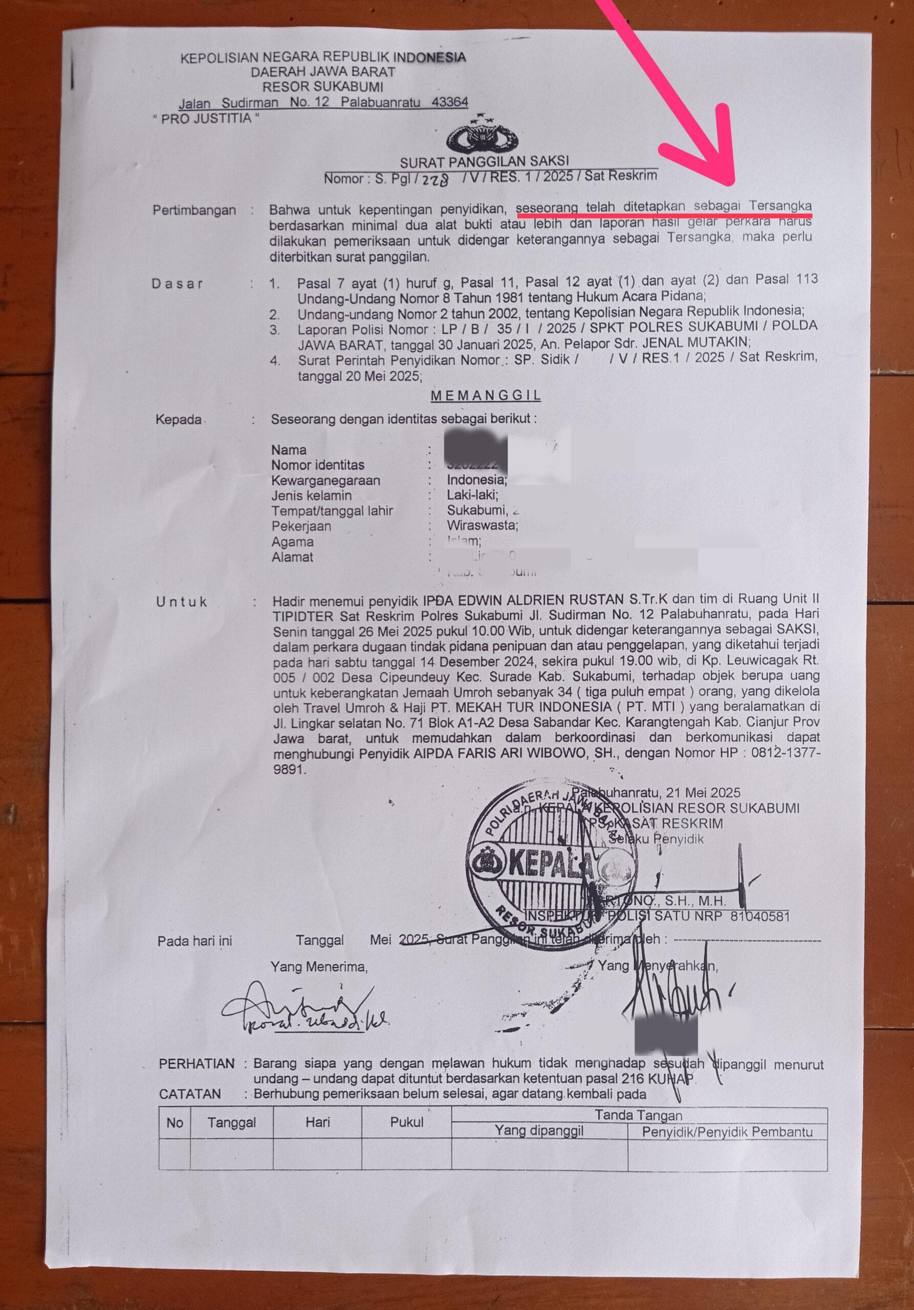 Adapun kasus ini berawal saat 65 warga di Jampang dan Pelabuhanratu, Kabupaten Sukabumi, mendaftar melalui pelapor Jenal Mutakin untuk menunaikan ibadah umroh pada akhir 2024 lalu.